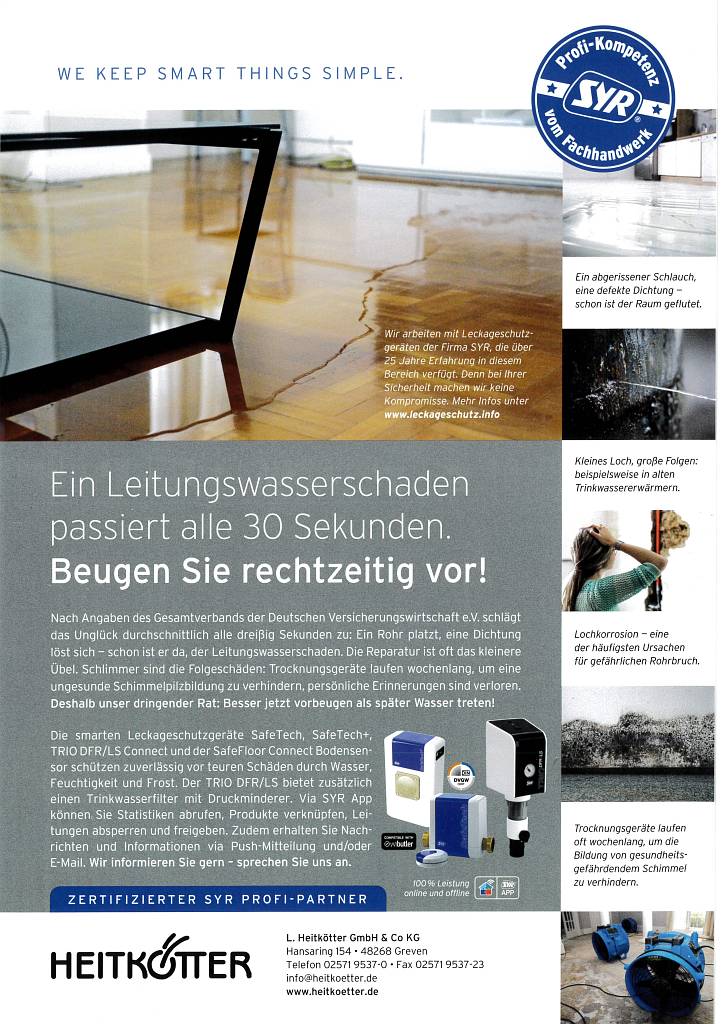Nach Angaben des Gesamtverbands der Deutschen Versicherungswirtschaft e.V. schlägt das Unglück durchschnittlich alle dreißig Sekunden zu: ein Rohr platzt, eine Dichtung löst sich — schon ist er da, der Leitungswasserschaden. Die Reparatur ist oftmals das kleinere Übel. Schlimmer sind die Folgeschäden....